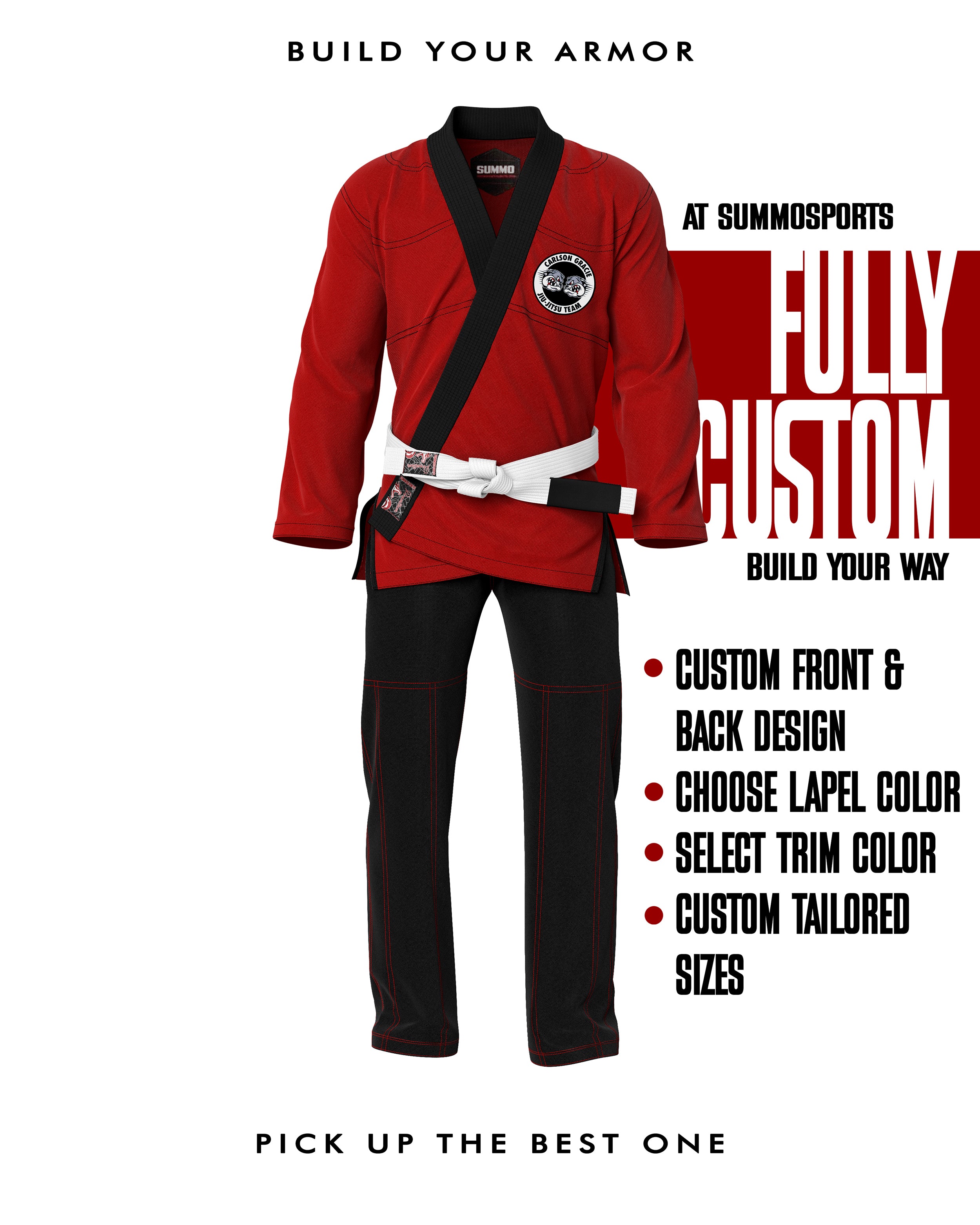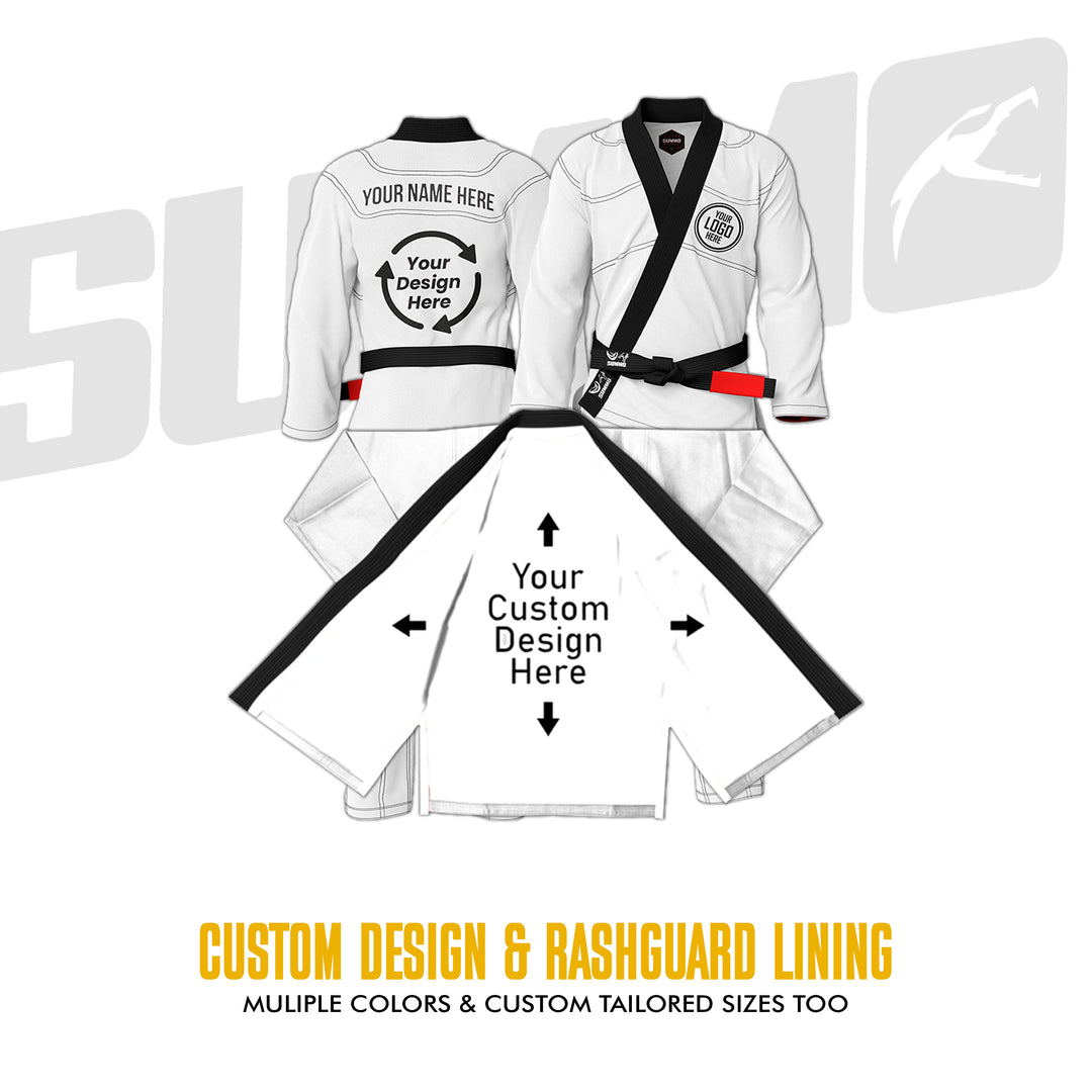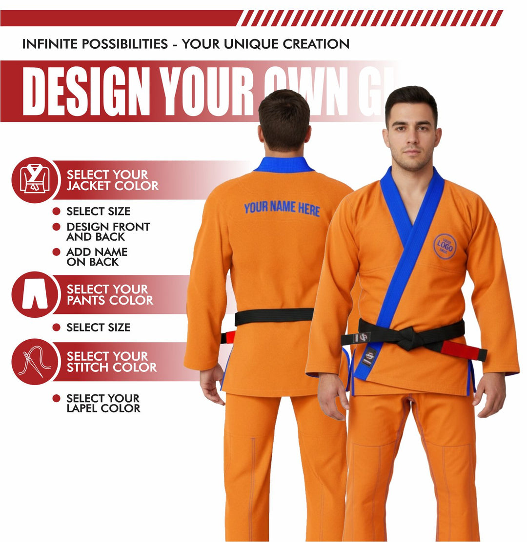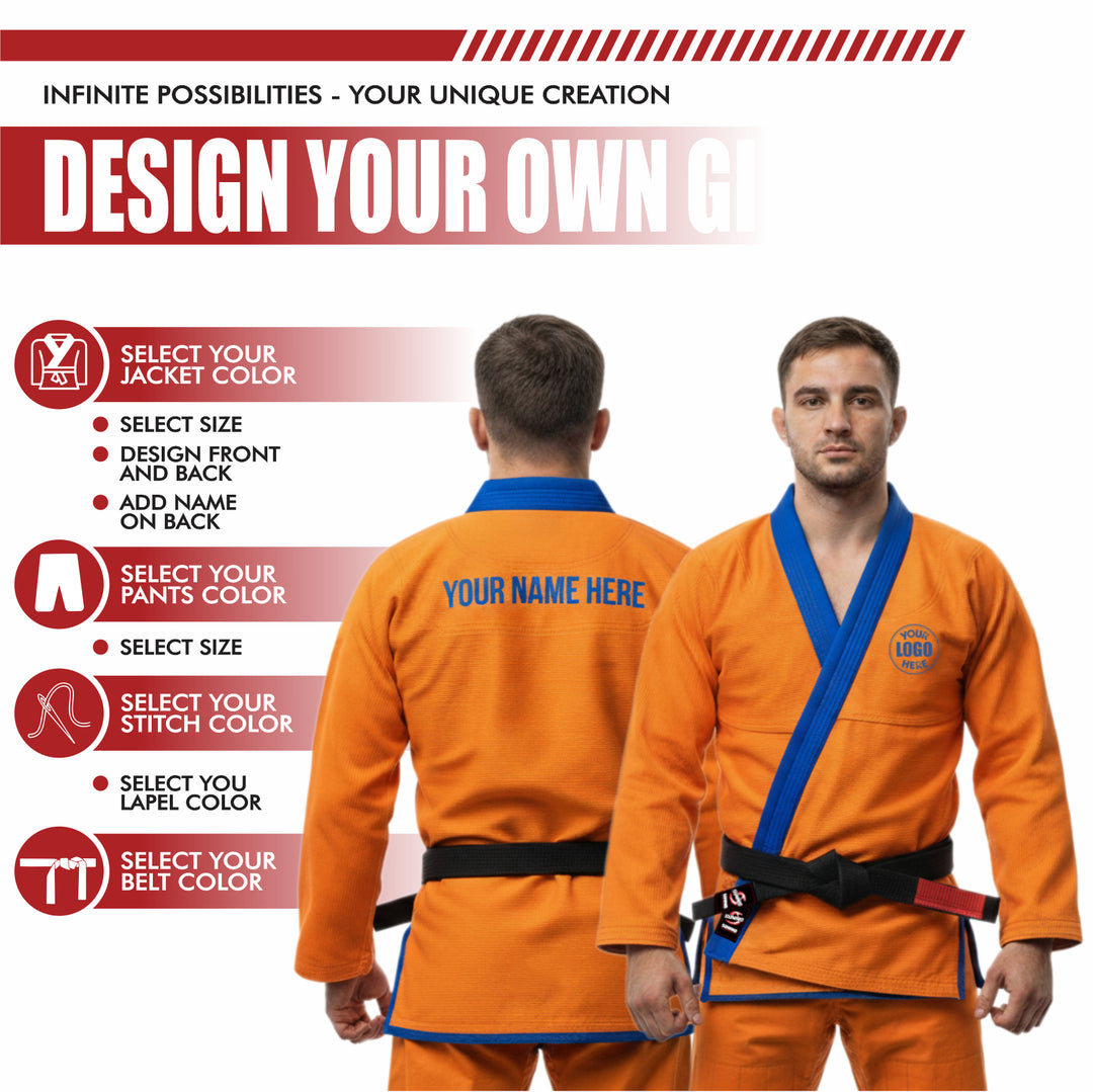 Design your own gi with full customization—stitching, lapel, jacket, pants, and logos. See a live preview as you build it, and even choose custom sizing made just for you.