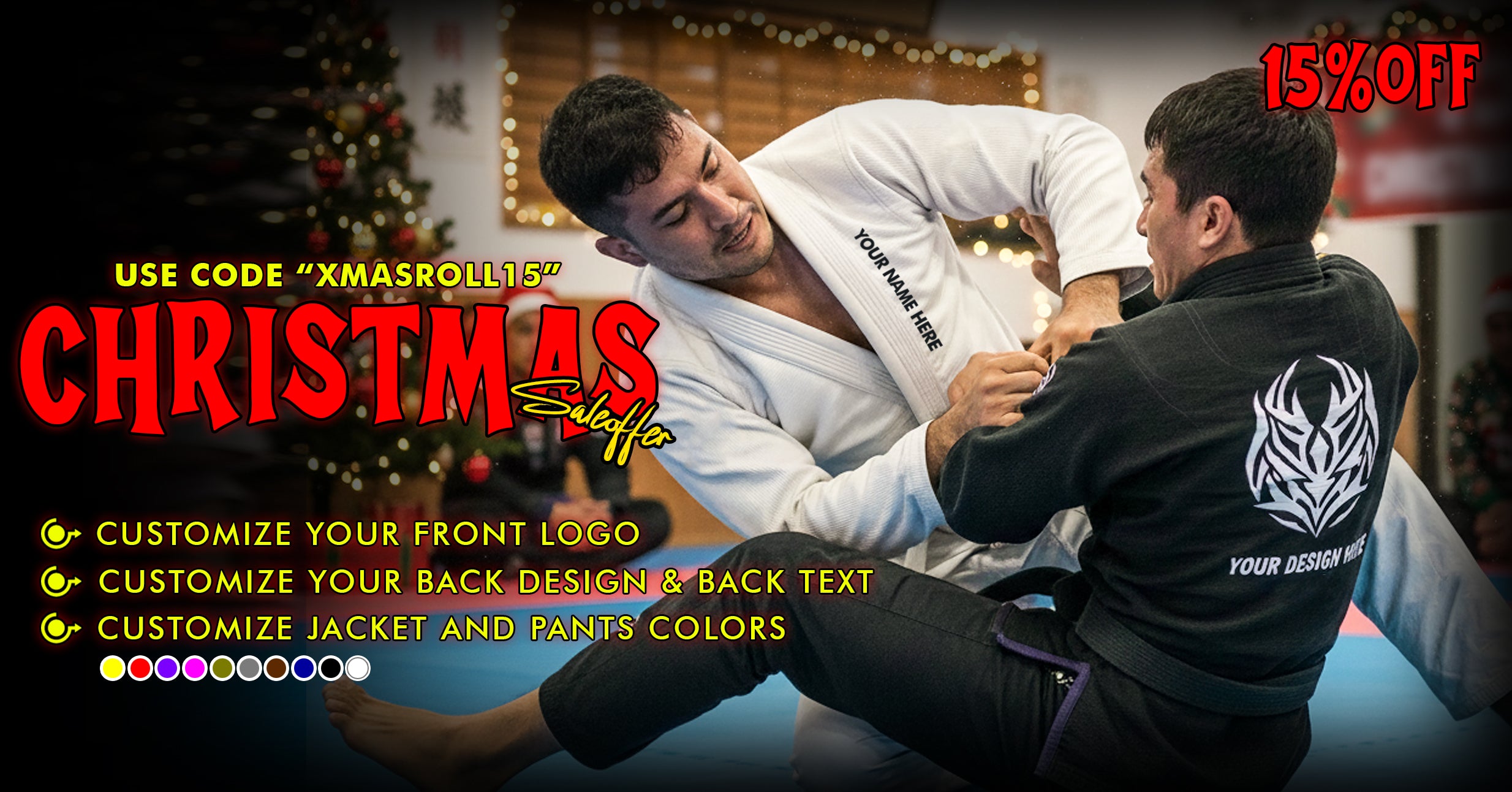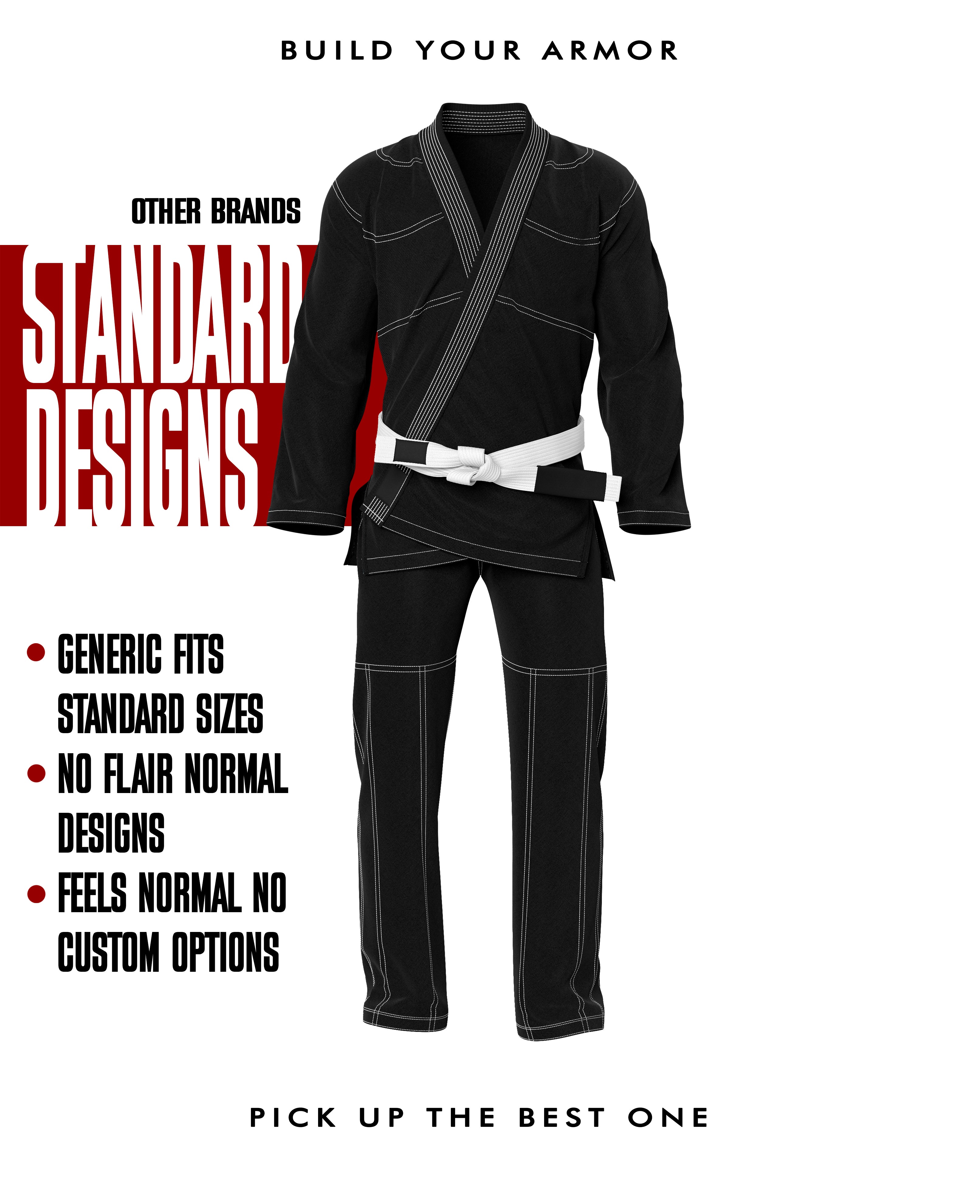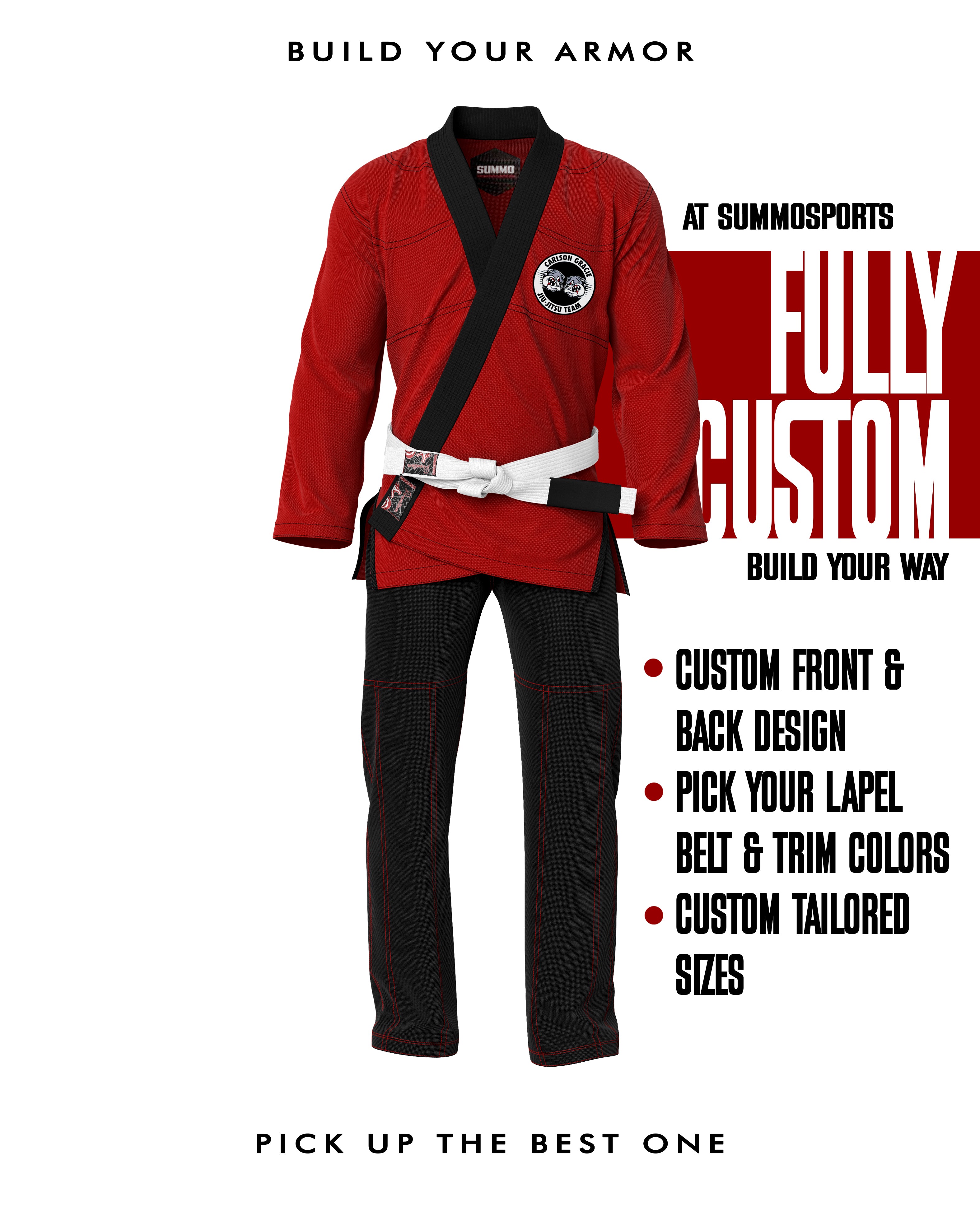Design your own gi with full customization—stitching, lapel, jacket, pants, and logos. See a live preview as you build it, and even choose custom sizing made just for you.