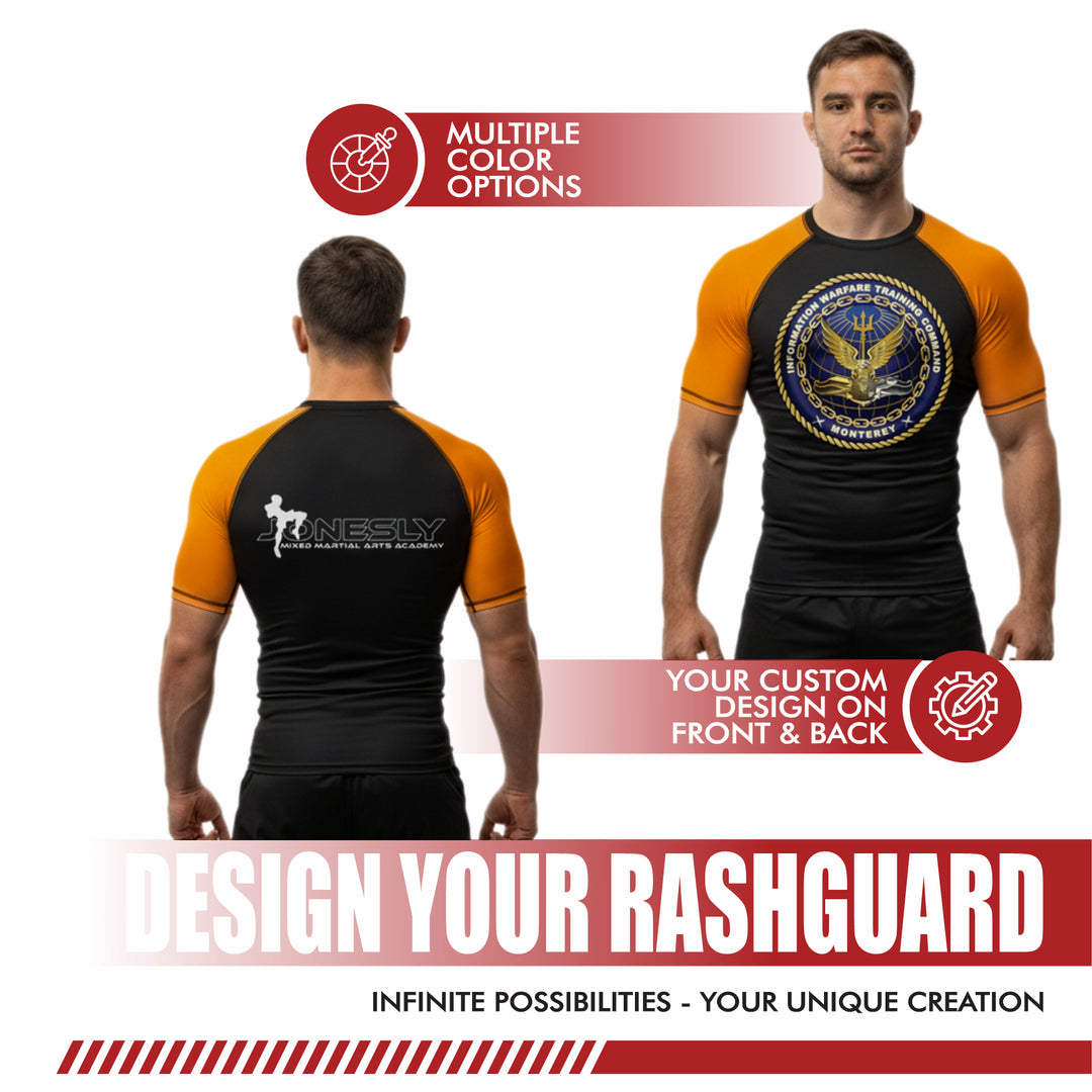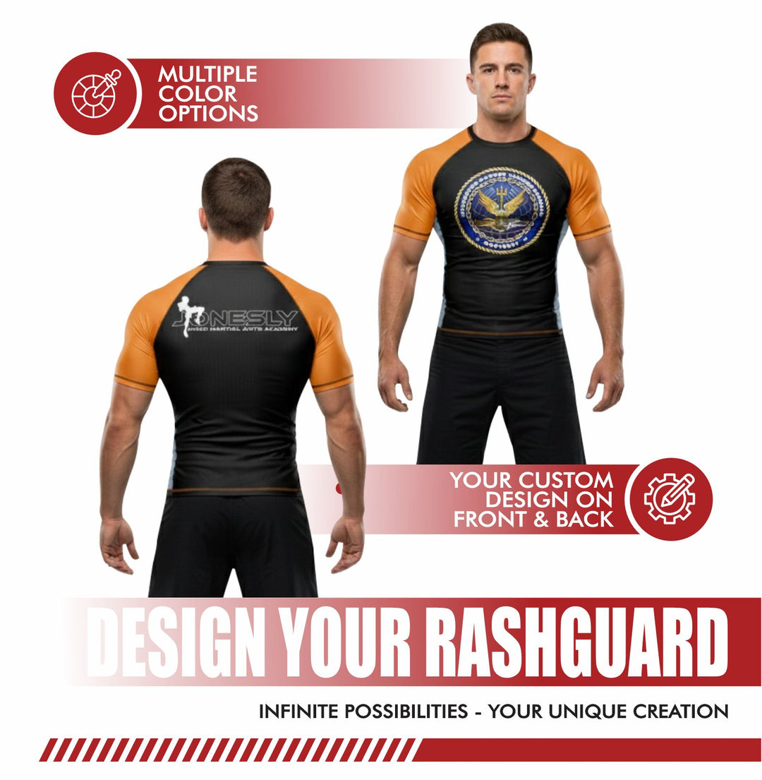 Build your perfect rashguard—pick sleeves, colors, and designs, and see it all in a live preview.