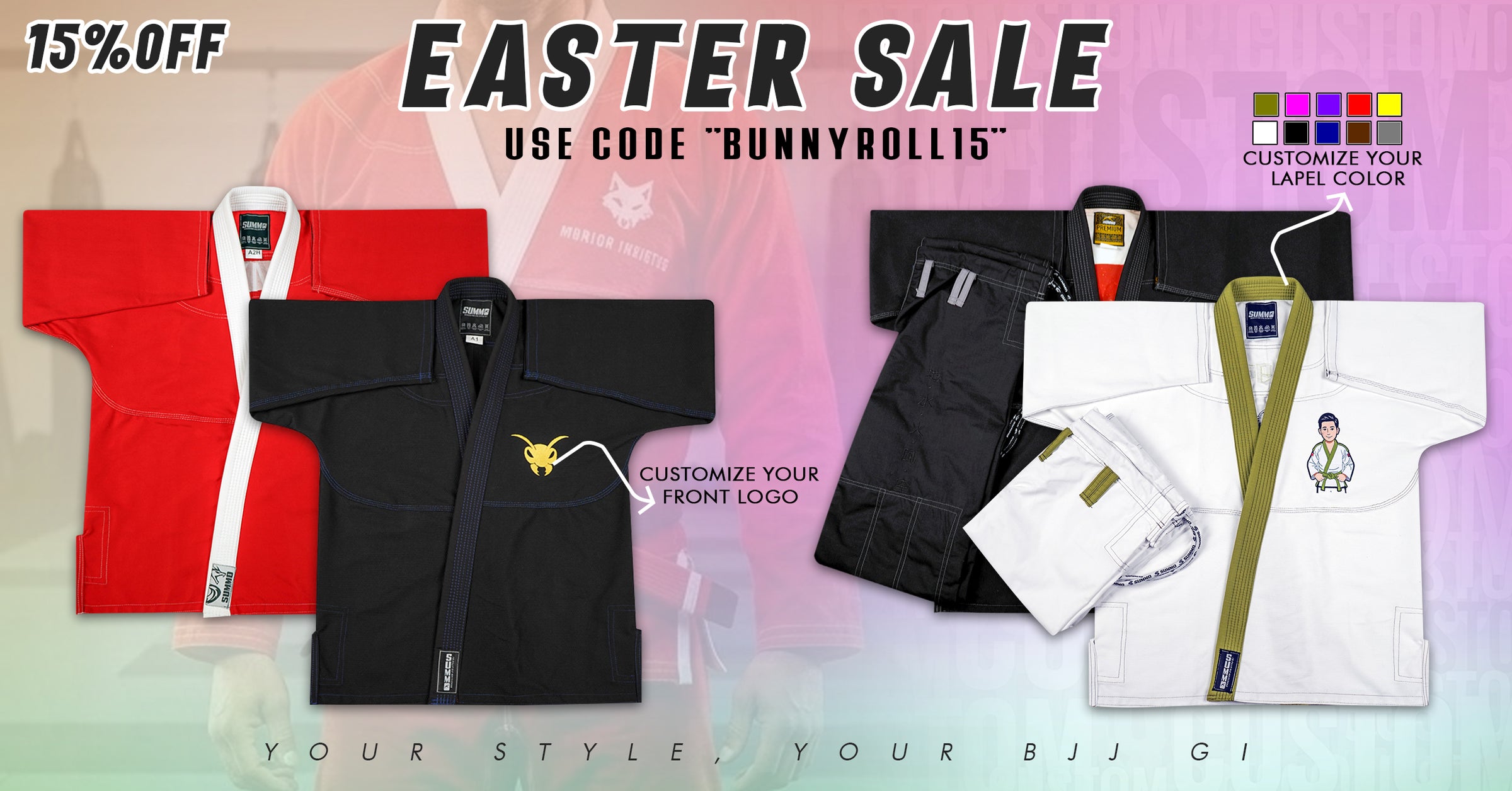 Design your own gi with full customization—stitching, lapel, jacket, pants, and logos. See a live preview as you build it, and even choose custom sizing made just for you.