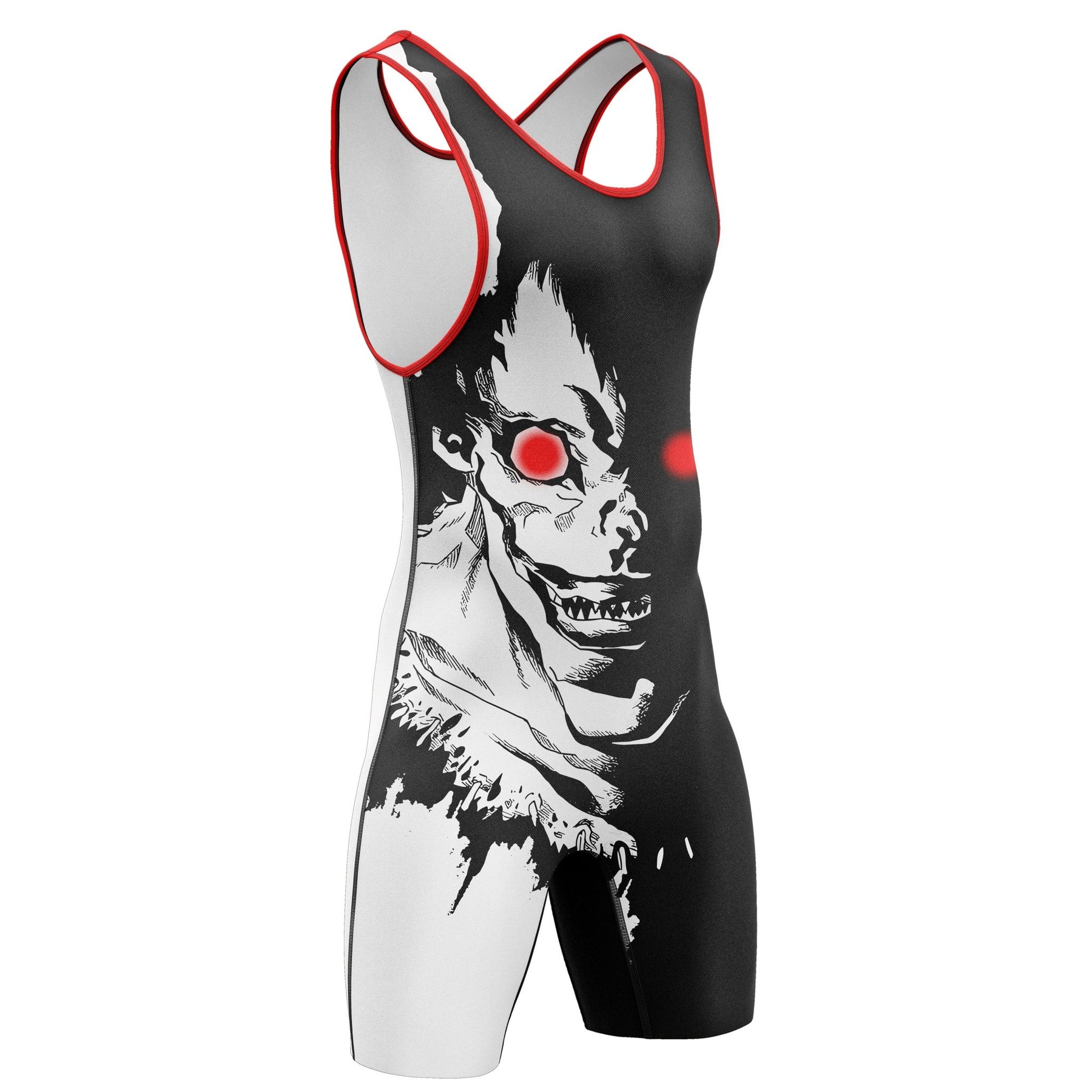 The Death Grip Premium Wrestling Singlet features a chilling face design with glowing red eyes for a fierce, intimidating look. Made with durable, stretch-fit fabric, it offers comfort, flexibility, and standout style for men, women, and youth in wrestling gear.