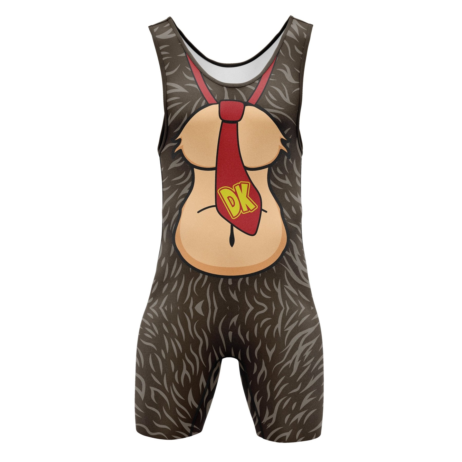 The Kong Guard Premium Wrestling Singlet features a gorilla skin design with a hanging tie in a funny style, finished in brown tones. Made with durable, stretch-fit fabric, it delivers comfort and mobility for men, women, and youth in standout wrestling gear.