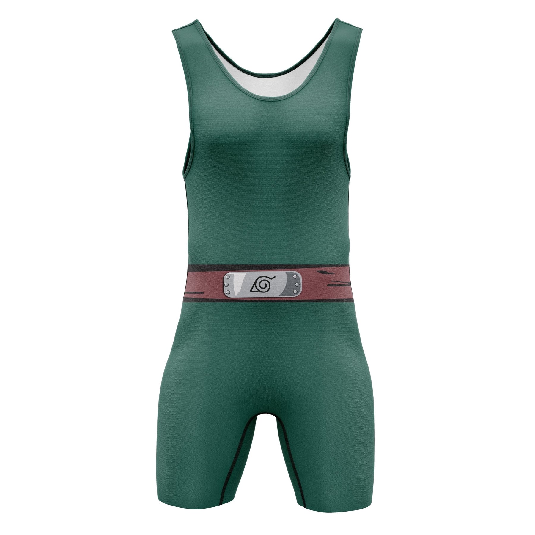 The Grapple Lee Premium Wrestling Singlet features a green base with a brown and grey belt design, inspired by martial arts tradition. Built with stretch-fit, durable fabric, it offers comfort and flexibility for men, women, and youth in reliable wrestling gear.